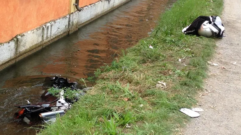 Incidente venerdì nel primo pomeriggio a Rezzato in via Treponti. Subito dopo la prima rotonda, un'auto e una moto si sono scontrate. Ad avere la peggio il centauro che per l'impatto è stato sbalzato dalla sella delle due ruote finendo nella roggia che corre parallela alla strada.