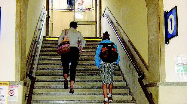 Ovviamente i problemi valgono anche per i viaggiatori disabili in arrivo che possono sì fruire dei servizi igienici, ma poi si trovano ad affrontare la lunga scala per scendere nell'atrio. Non esiste una rampa per disabili in carrozzina. Al'esterno c'è una stradina in asfalto dalla pendenza accentuata che porta ad un edificio a livello dei binari, ma che è - recita un cartello - «vietata agli estranei al servizio». E comunque da lì non c'è accesso alla banchina impedita da paletti e catenelle.