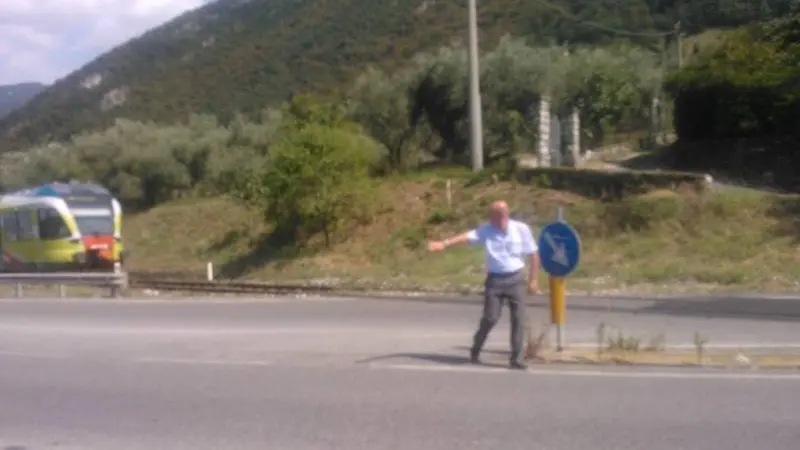 Una scena immortalata da alcuni automobilisti: per consentire il passaggio del convoglio della Brescia-Iseo-Edolo, il capotreno si è messo in mezzo alla strada bloccando il traffico e consentendo così al treno di transitare in sicurezza.