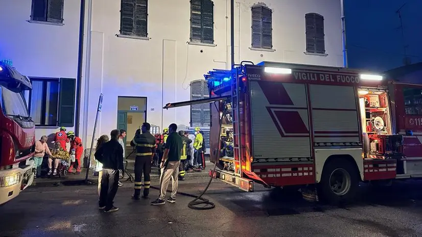 I Vigili del fuoco impegnati a Manerbio per spegnere l'incendio divampato in una palazzina © www.giornaledibrescia.it