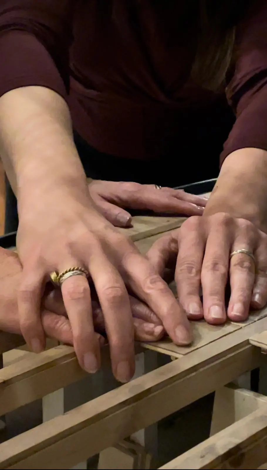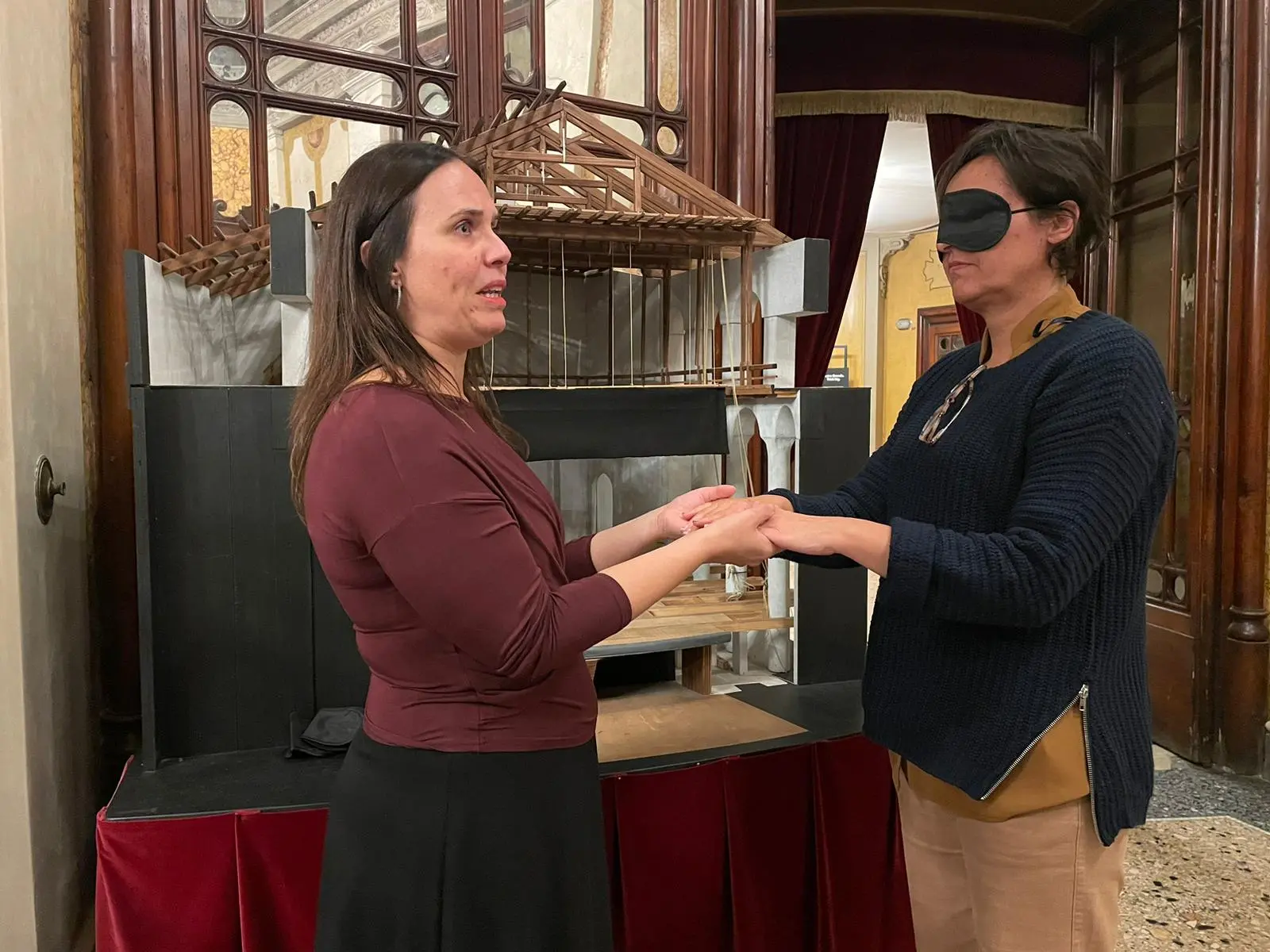 Il gran finale della visita è un’esperienza tutta al buio: a turno le persone si bendano e visitano il modellino del teatro attraverso il tatto. La guida – con le mani intrecciate a quelle dei visitatori – li guida passo per passo: prima l’ingresso con il legno di rovere, lo stesso del parquet del teatro, poi il corridoio lungo e stretto per arrivare fino al palco.