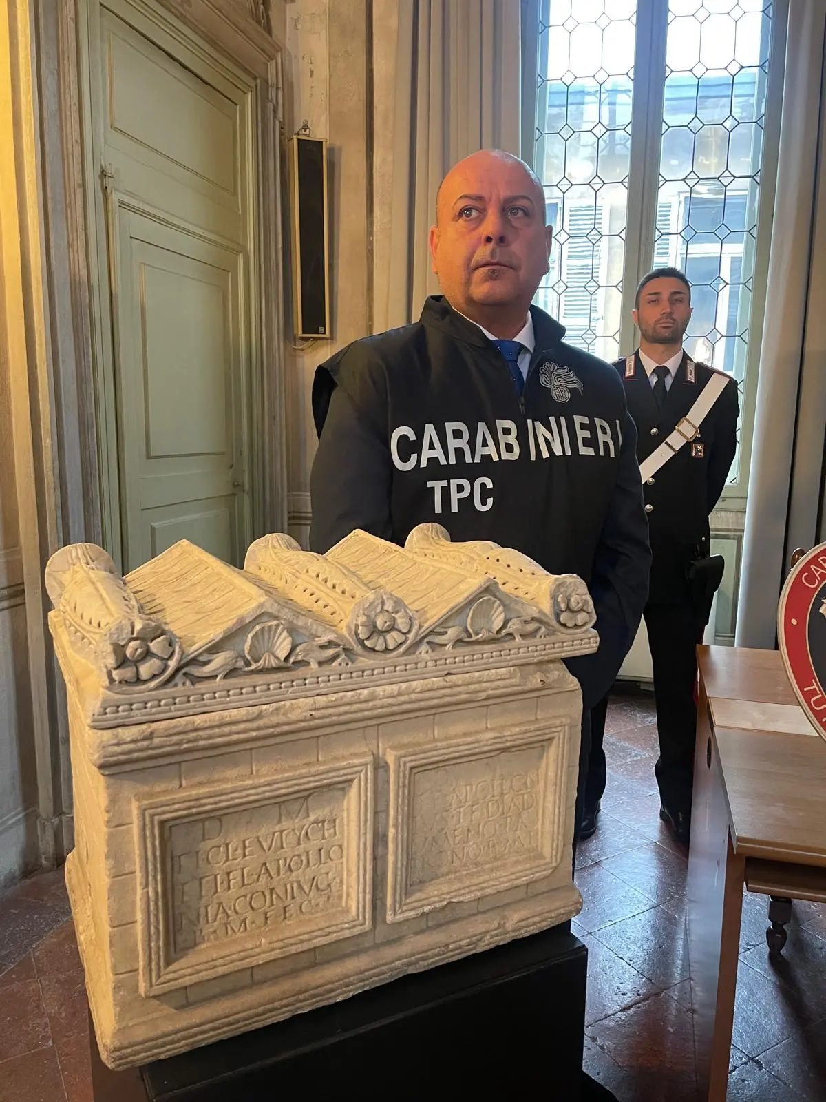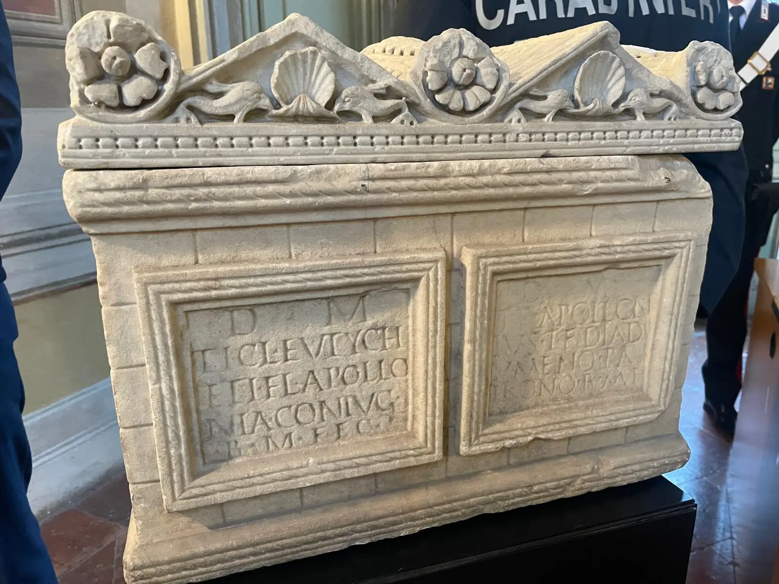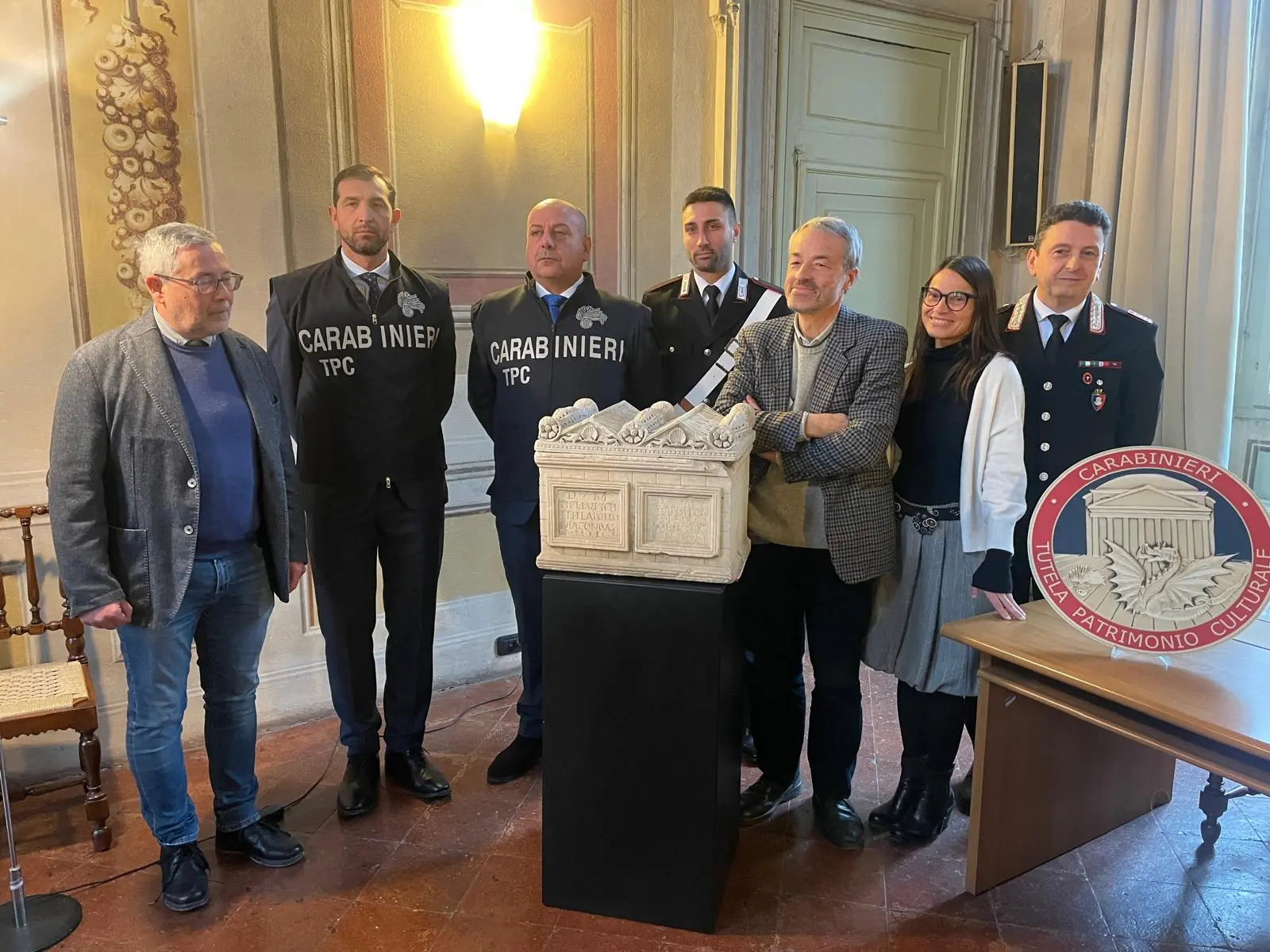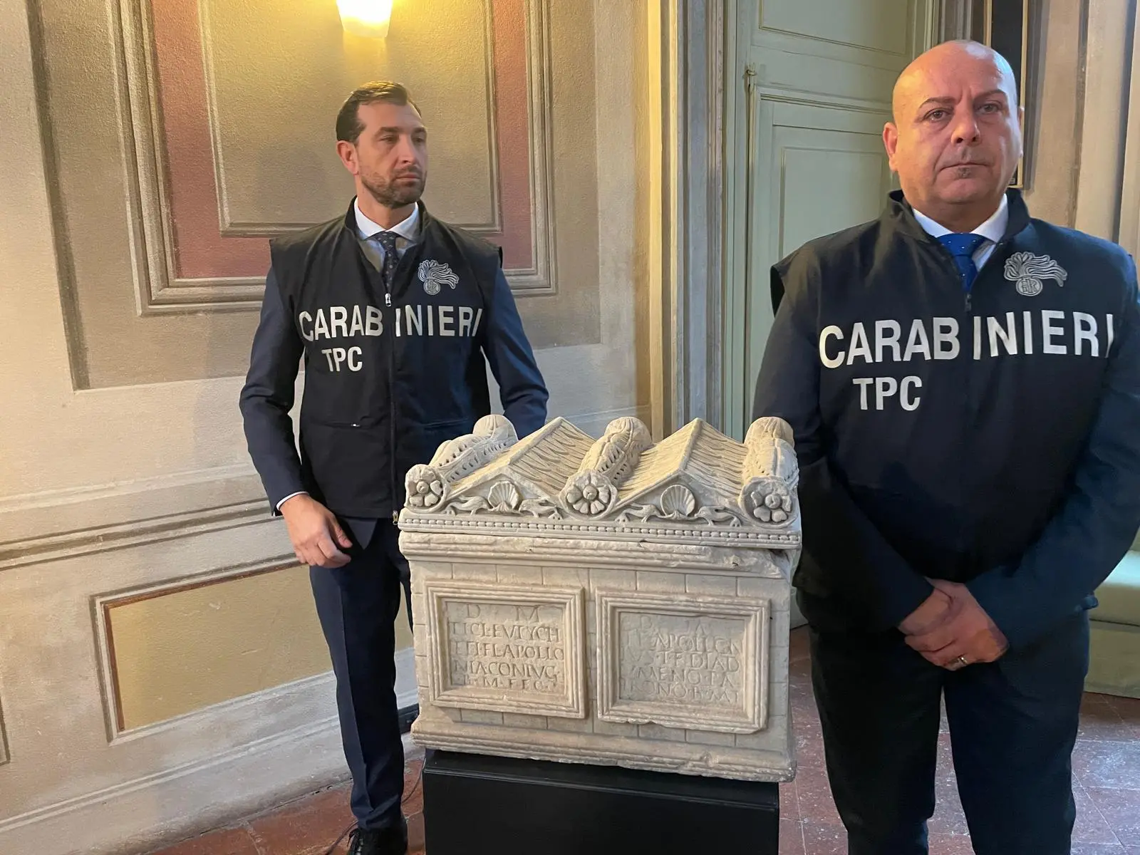 Tra i reperti recuperati spicca un’urna cineraria in marmo con coperchio, di eccezionale valore storico e scientifico. L’opera era già nota alla comunità degli studiosi perché pubblicata nel Corpus Inscriptionum Latinarum ed era attribuita alla prestigiosa collezione Giustiniani di Roma, considerata dispersa dalla fine del XIX secolo. L’urna era stata vista per l’ultima volta a Palazzo Giustiniani, oggi sede di rappresentanza del Senato della Repubblica.