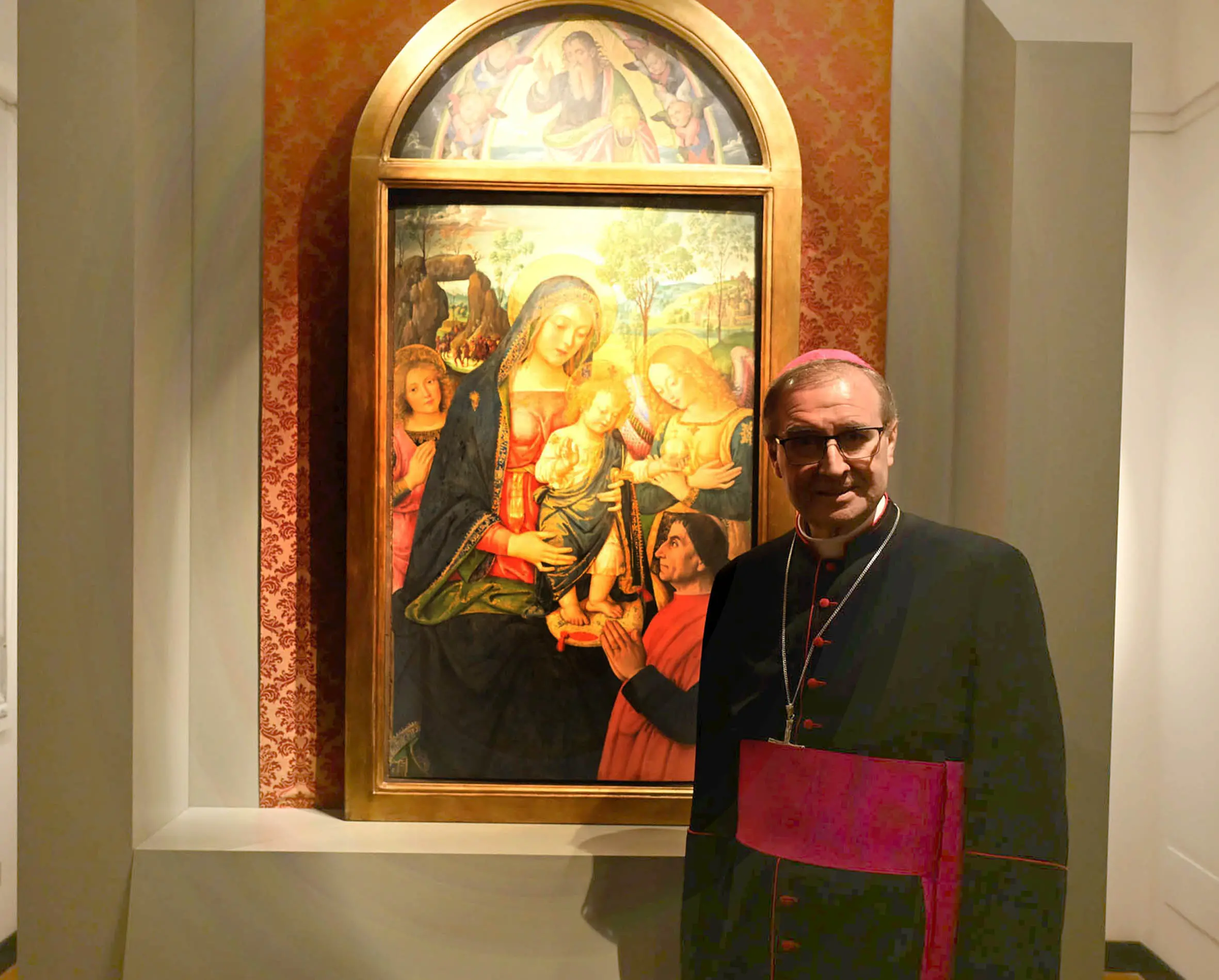 E il gusto per la pittura raffinata e descrittiva, per i colori brillanti lumeggiati d’oro si ritrova nella preziosa «Madonna della Pace» che fino all’8 marzo sarà protagonista al Museo Diocesano di Brescia della nuova edizione di «Adoremus», l’invito alla meditazione attraverso la contemplazione della bellezza in occasione del tempo di Natale. Il dipinto, una tempera su tavola, fu realizzato attorno al 1490 a Roma per il canonico Libero Bertelli, raffigurato nel dipinto, che inviò l’opera al proprio paese natale San Severino Marche. Qui il dipinto è rimasto, sopravvivendo anche al terremoto del 2016, ora accolto al Marec - Museo dell’arte recuperata ospitato nel palazzo vescovile di San Severino, che l’ha inviato a Brescia in una sorta di scambio reciproco: il nostro Museo Diocesano si occuperà infatti del restauro di un altro dipinto danneggiato dal sisma.