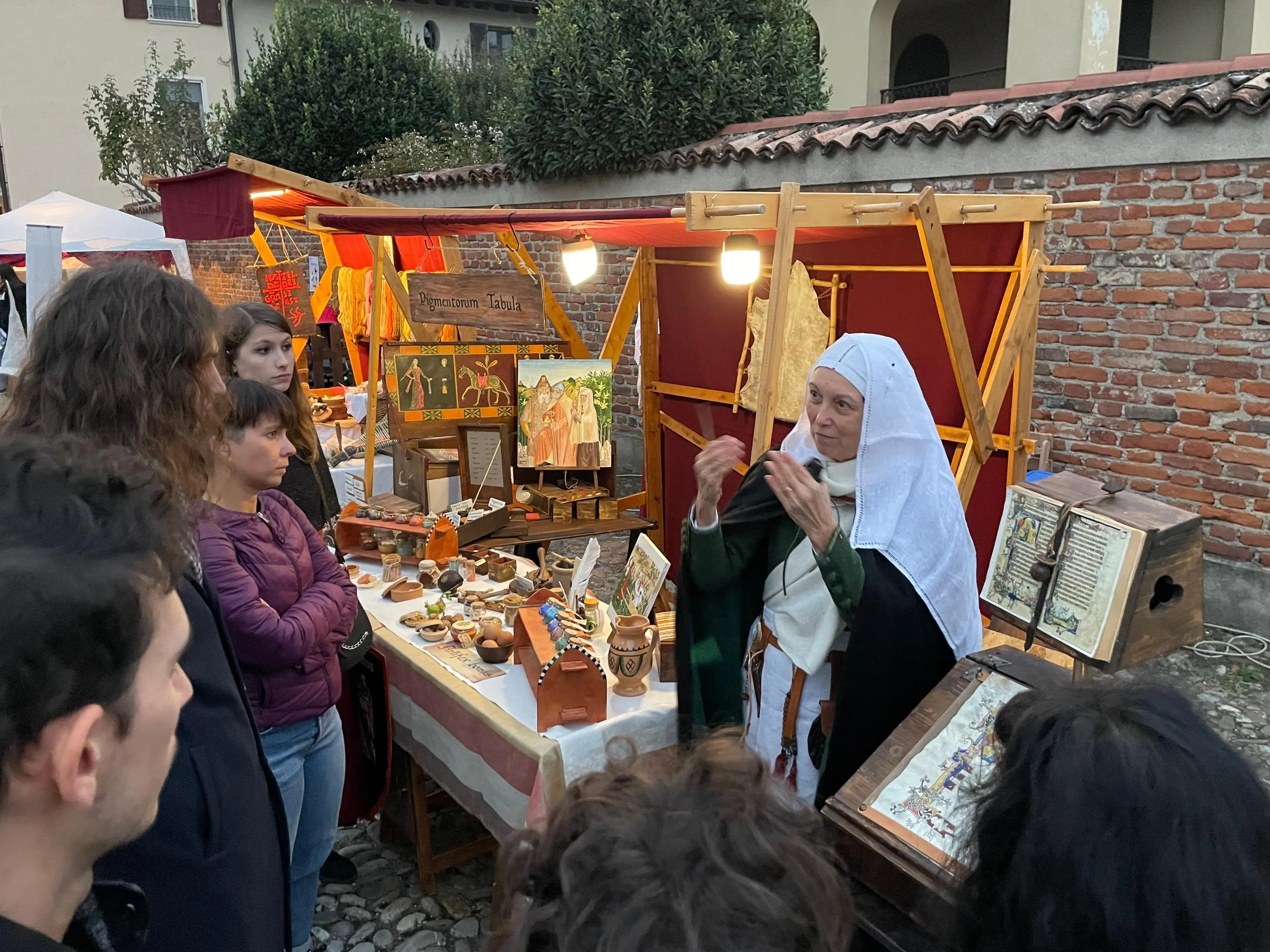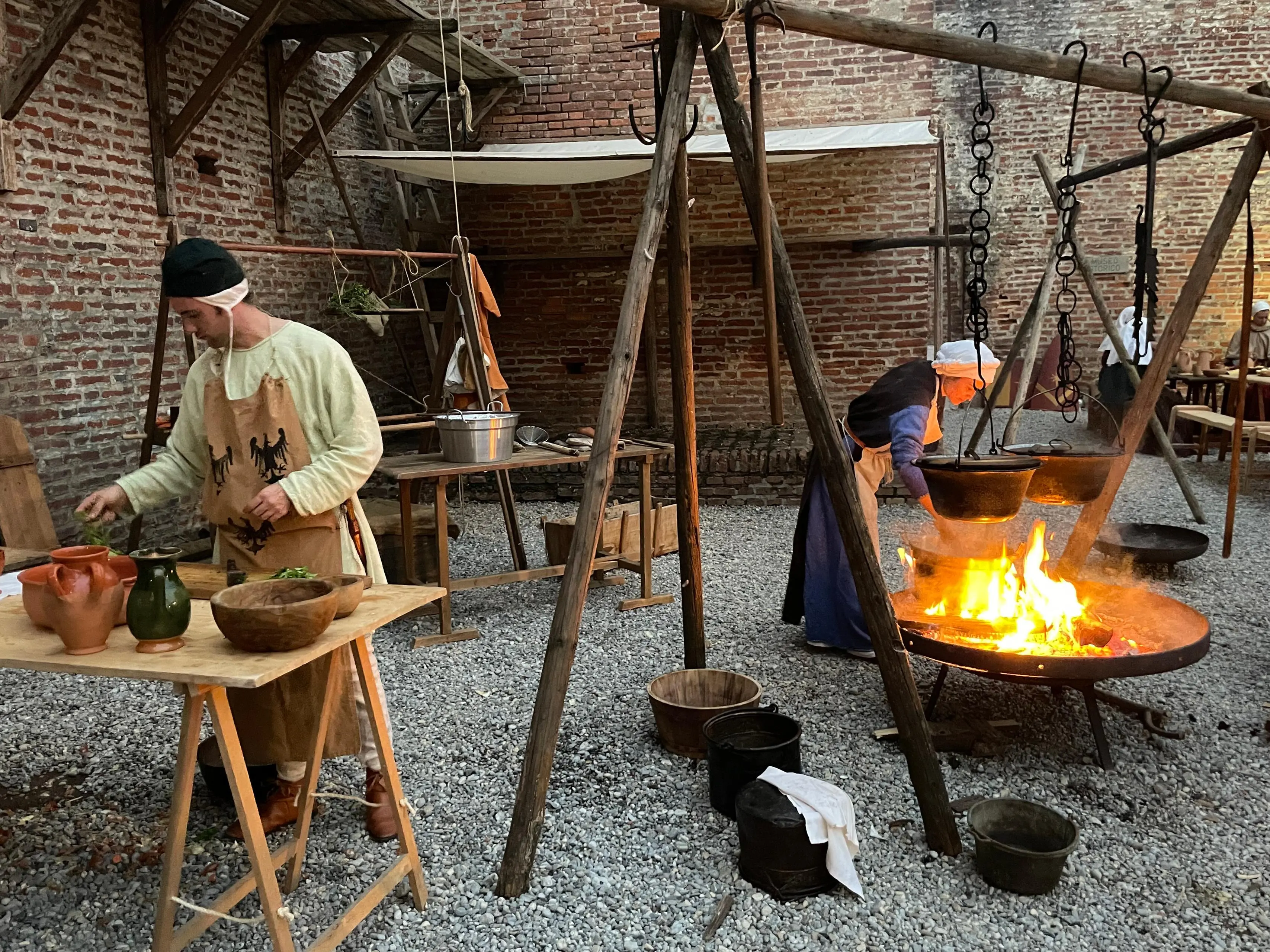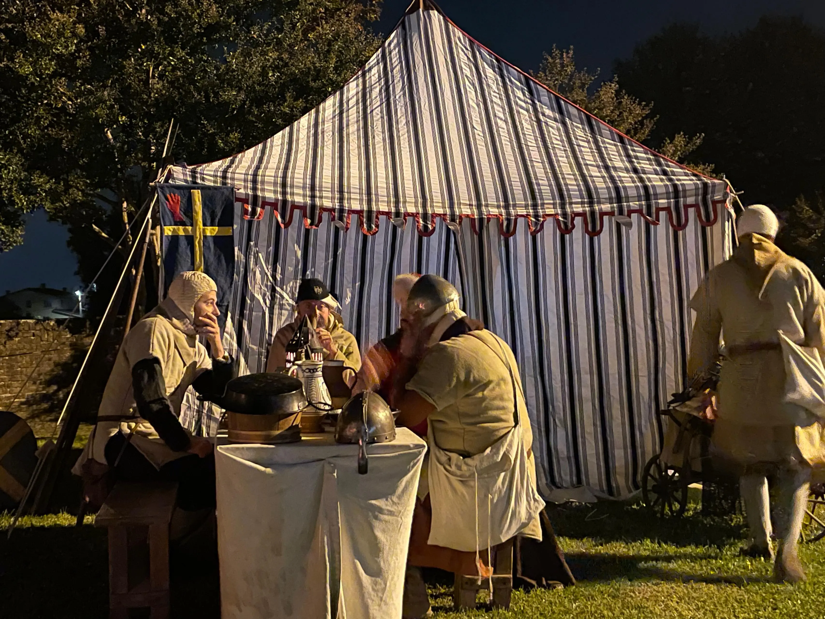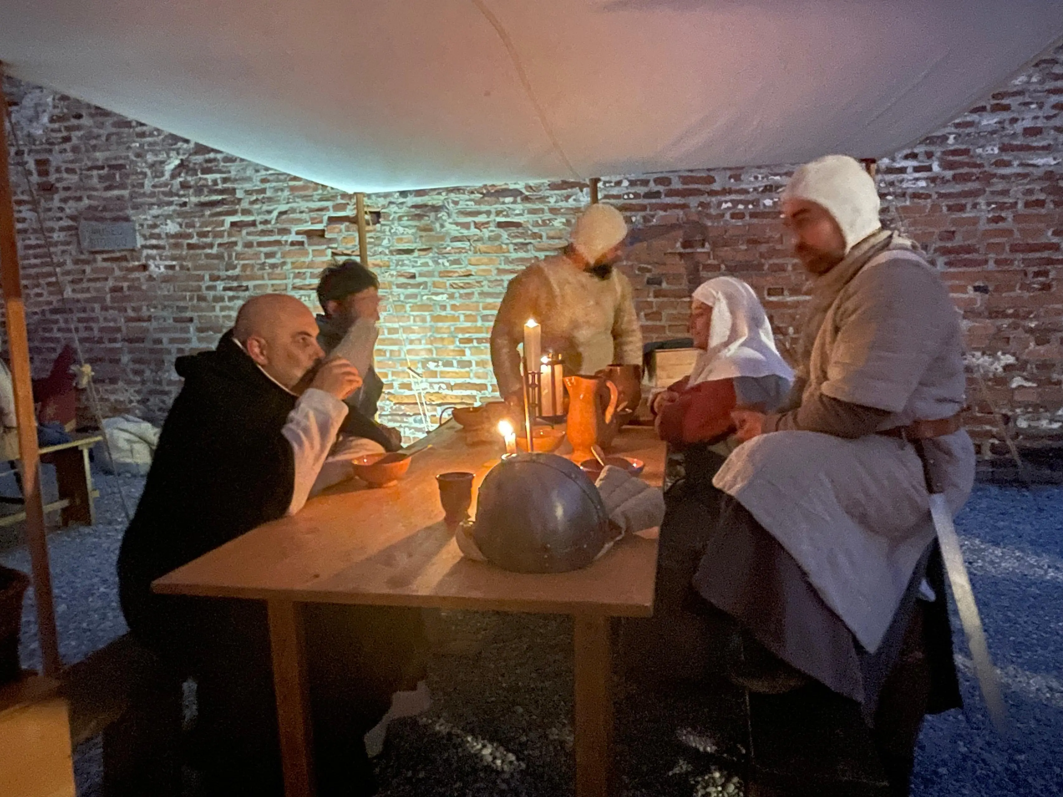 Chi ha varcato il ponte levatoio si è trovato immerso in un grande accampamento medievale. Tante le scene di vita quotidiana: fuochi accesi sotto pentoloni di rame dove sono state cotte zuppe e carni; banchi di fabbri che hanno forgiato ferro rovente e hanno attizzato la brace con grandi mantici; mercanti che hanno mostrato pelli e trappole da caccia, alchimisti circondati da ampolle e vasi di spezie; scrivani chini su pergamene illuminati da candele e tanto altro.