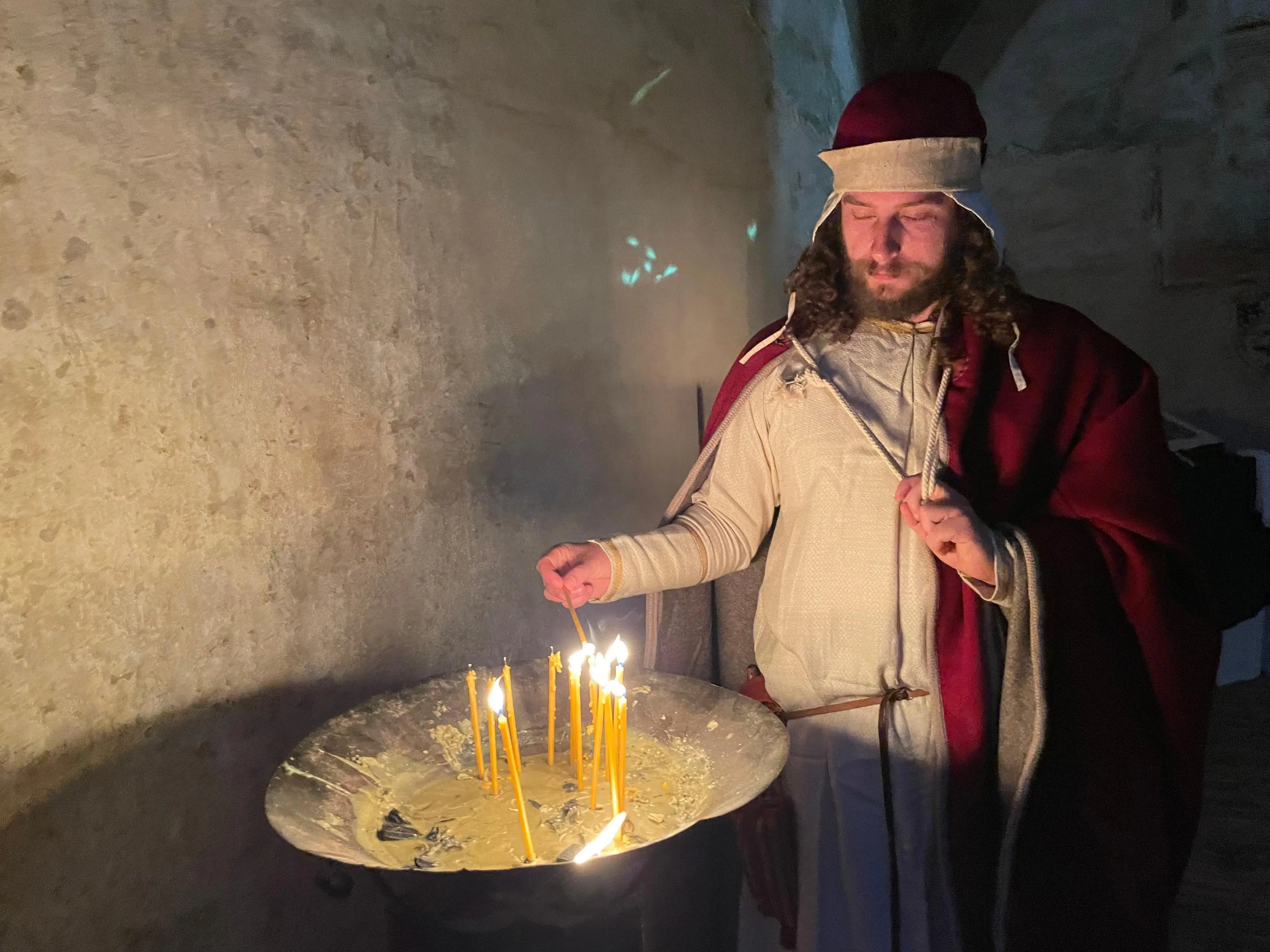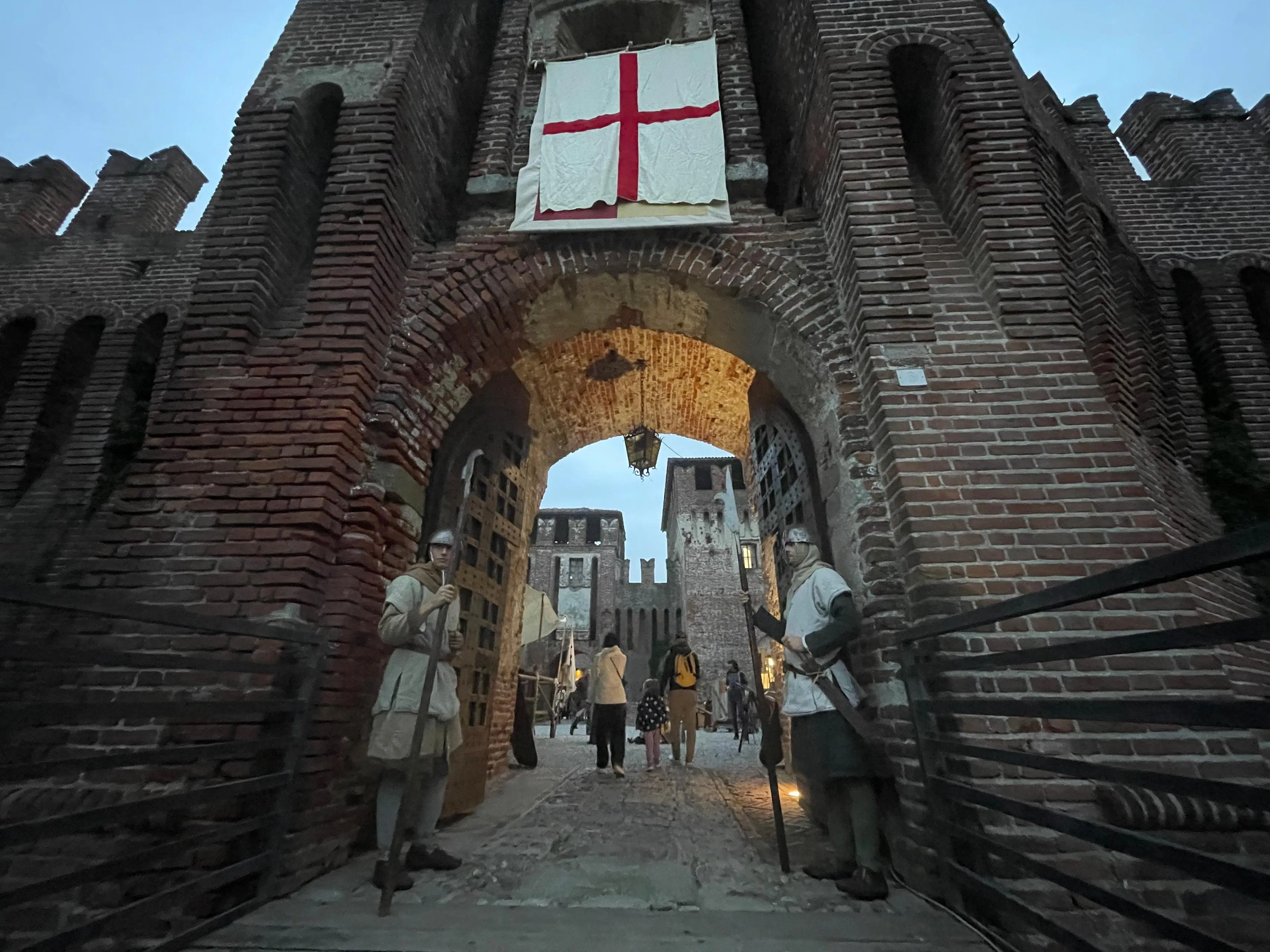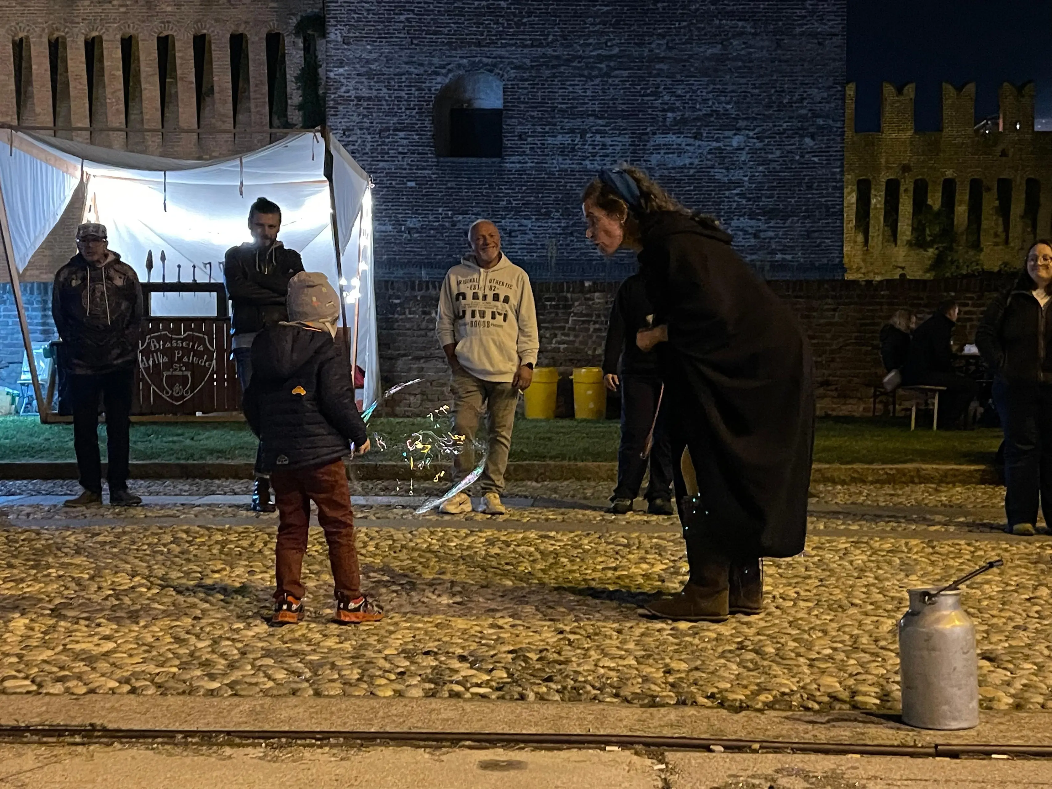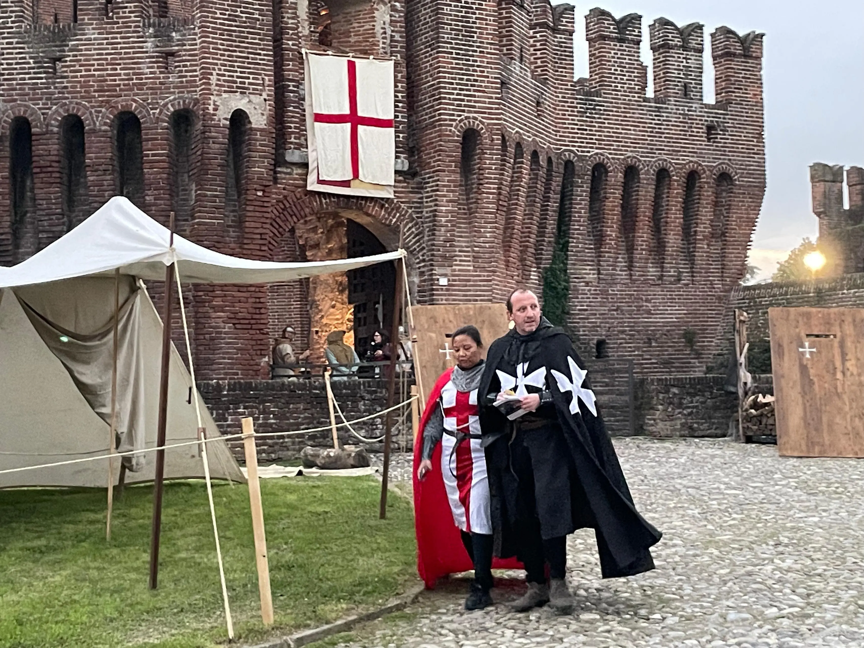 Ovunque si sono viste lanterne, scudi, selle e armi, e un brulichio di costumi curati nei dettagli, tra mantelli pesanti, cappucci e croci araldiche. Non sono mancati falchi e barbagianni che i falconieri hanno mostrato con orgoglio ai visitatori, così come un «discendente» del lupo nero, richiamo diretto alla leggenda dei protagonisti del film. Dai camminamenti la vista si è aperta su un cortile gremito di pubblico e rievocatori, tra risate, musiche di menestrelli e giocolieri che hanno divertito anche i più piccoli con bolle di sapone e giochi di piazza.