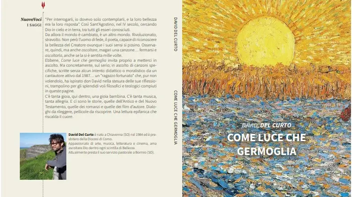 “Come luce che germoglia”diDon David Del Curto, pubblicato per ilGruppo Albatros Il Filo, entra proprio in questo spazio. Lo fa con un gesto audace:mette in dialogo la pagina biblica con il repertorio di Jovanotti, scegliendo la canzone come soglia emotiva di ogni capitolo, come innesco di memoria e attenzione. Ogni tappa porta un tema e un titolo musicale, fino a trasformare la lettura in un cammino scandito da tracce, figure, ritorni.