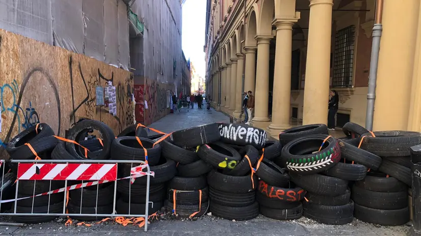 BOLOGNA, 02 OTT - I collettivi universitari a Bologna questa mattina sono tornati in azione bloccando diverse sedi universitarie per manifestare contro l'arresto degli equipaggi della Global Sumud Flotilla. "Block the University" recita uno striscione all'ingresso del rettorato. In via Zamboni c'è una barriera realizzata con copertoni e sedie, mentre l'ingresso di molte facoltà è bloccato dai picchetti dei collettivi. Tende sono spuntate in rettorato, che risulta bloccato.