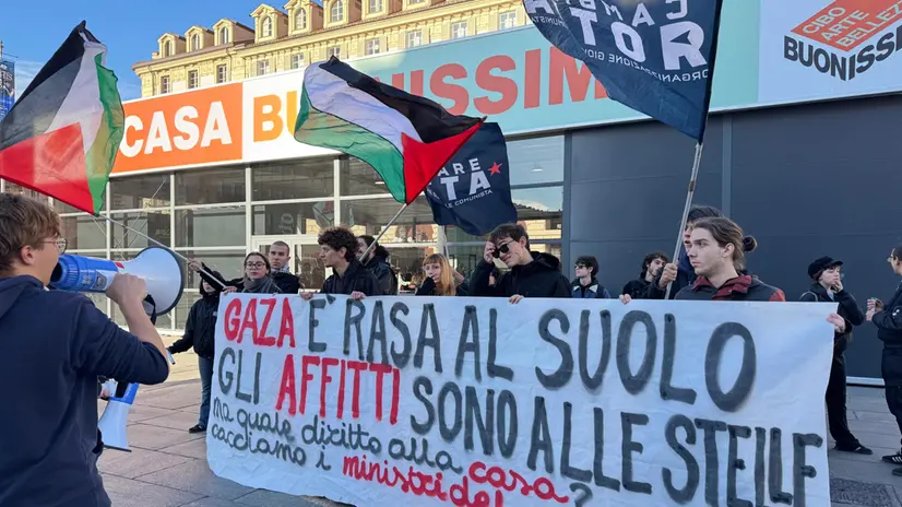 TORINO, 25 OTT - "Blocchiamo Tajani". Sotto questo slogan un centinaio di antagonisti e attivisti pro Palestina si sono radunati questa mattina in piazza Castello, a Torino, a poche centinaia di metri da piazza Carignano e dall'omonimo teatro dove è arrivato il ministro degli Esteri Antonio Tajani per partecipare agli Stati generali della Casa, convocati da Forza Italia. Nell'area intorno a dove si svolge l'incontro è presente un dispiegamento di forze dell'ordine, con mezzi e uomini. "Tajani parla di casa mentre a Gaza le case non ci sono più", si legge nel post che annunciava la manifestazione. Uno striscione del collettivo universitario Cambiare Rotta recita: "Gaza è rasa al suolo, gli affitti sono alle stelle. Ma quale diritto alla casa? Cacciamo i ministri del genocidio". "Blocchiamo i ministri della guerra non saremo complici del genocidio" si legge su un altro striscione di Torino per Gaza. Presenti oltre le bandiere palestinesi anche quelle del sindacato di base Cub.
