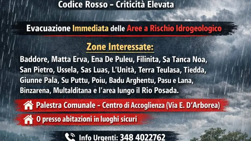 NUORO, 19 GEN - A causa dell'ingrossamento del Rio Posada, dovuto alle forti precipitazioni di queste ore con il passaggio della tempesta mediterranea sulla Sardegna, il comune di Torpè, nel Nuorese, ha evacuato decine di famiglie in alcune aree limitrofe al corso d'acqua e alla diga. In particolare l'avviso dell'amministrazione, pubblicato anche sui social, riguarda le località di Baddore, Matta Erva, Ena De Puleu, Filinita, Sa Tanca Noa, San Pietro, Ussela, Sas Luas, L'Unità, Terra Teulasa, Tiedda, Giunne Pala, Su Puttu, Poiu, Badu Arghentu, Pasu e Lana, Binzarena, Multalditana e l'area lungo il Rio Posada. Un centro di accoglienza è stato allestito nella palestra comunale in via D'Arborea ma, in alternativa, i residenti si potranno recare in "altre abitazioni in luogo sicuro" Il comune raccomanda di "chiudere gas, acqua ed elettricità e di non sostare nelle zone a rischio, oltre che seguire gli itinerari di evacuazione e portare medicinali ed effetti personali".