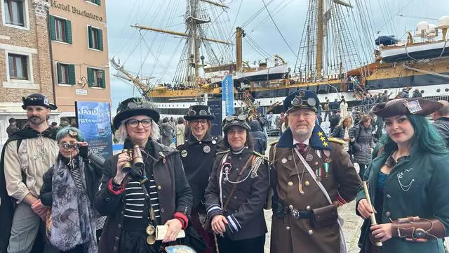 VENEZIA, 29 MAR - L'Amerigo Vespucci mette le ali. L'avveniristico progetto fantasy porta la firma dell'associazione culturale "Steampunk Nord-Est" i cui rappresentanti oggi hanno visitato il veliero della Marina Militare in occasione della seconda tappa del Tour Mediterraneo del Vespucci a Venezia. In perfetto stile vittoriano, tra cilindri e ombrellini, binocoli e divise d'epoca, i membri del gruppo hanno attirato l'attenzione di passanti e turisti lungo Riva San Biasio, prestandosi a foto e video dal sapore british con la laguna a fare da sfondo. Il progetto, ovviamente fantascientifico così come la corrente letteraria alla quale si ispira il mondo steampunk, prevede addirittura formule, numeri e tabelle per calcolare la quantità di elio necessario per far alzare in "volo" la nave più bella del mondo, come in uno dei più classici film fantasy. "La nostra è un'associazione che si ispira al movimento steampunk, nato alla fine degli anni 80-90 - ha detto una dei membri, Alessandra Carrer -. Ci ispiriamo alla moda vittoriana dell'800 ma con elementi di fantascienza. Siamo qui perché abbiamo un progetto dedicato al Vespucci veliero volante. Abbiamo approfittato dell'occasione di vedere questo meraviglioso veliero spacciandoci ironicamente per il nuovo equipaggio. Speriamo che anche il comandante apprezzi il nostro progetto".