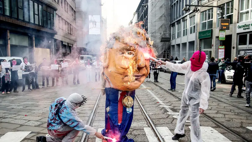 Bruciato un fantoccio di Trump al corteo per lo sciopero a Milano