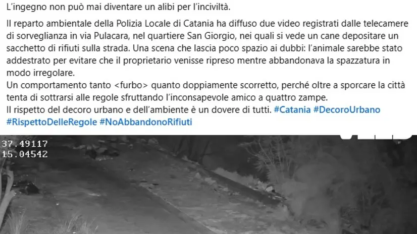 CATANIA, 19 FEB - Un cane con un sacchetto dei rifiuti percorre via Pulacara, nel rione San Giorgio di Catania, e poi abbandona la spazzatura in una piccola aerea trasformata in discarica abusiva. Lo hanno scoperto al Comune quando hanno visionato le immagini della telecamera istallata per scoprire e punire chi abbandona illegalmente i rifiuti. Dai filmati si vede un cagnolino di piccola taglia portare in bocca un sacchetto di rifiuti e depositarlo in strada. E non è stato un caso episodico, ma per due giorni di fila. Per il Comune di Catania sarebbe una tecnica adoperato dal proprietario del cagnolino per buttare illegalmente i rifiuti senza essere ripreso dalla telecamera di 'sorveglianza' dell'Ente. La storia è riportata sulla pagina Facebook del Comune di Catania assieme alla pubblicazione dei due video in cui il cane deposita il sacchetto della spazzatura e il commento "l'ingegno non può mai diventare un alibi per l'inciviltà". "Il reparto ambientale della polizia locale di Catania - si legge nel post - ha diffuso due video registrati dalle telecamere di sorveglianza in via Pulacara, nel quartiere San Giorgio, nei quali si vede un cane depositare un sacchetto di rifiuti sulla strada. Una scena che lascia poco spazio ai dubbi: l'animale sarebbe stato addestrato per evitare che il proprietario venisse ripreso mentre abbandonava la spazzatura in modo irregolare. Un comportamento - si sottolinea dal Comune di Catania - tanto furbo quanto doppiamente scorretto, perché oltre a sporcare la città tenta di sottrarsi alle regole sfruttando l'inconsapevole amico a quattro zampe. Il rispetto del decoro urbano e dell'ambiente è un dovere di tutti".