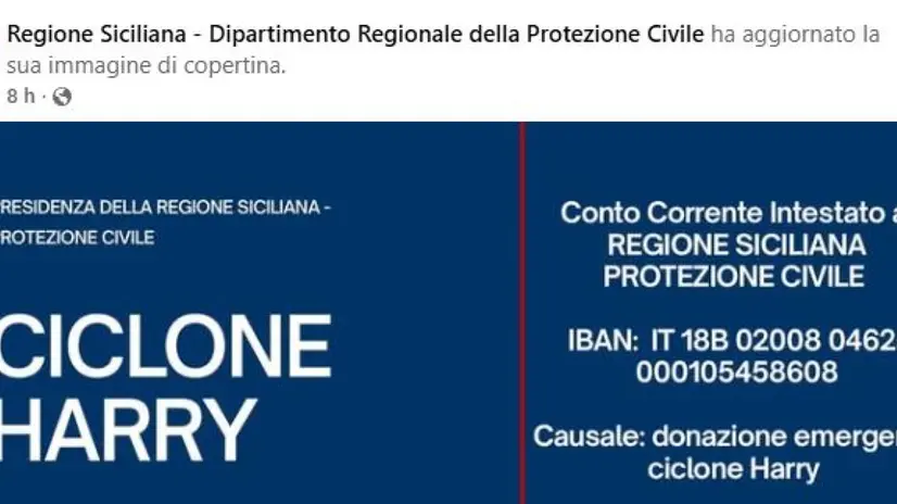 CATANIA, 30 GEN - In Sicilia è stato attivano un conto corrente per donazioni a persone e attività colpite dal ciclone Harry. E' intestato a 'Regione Siciliana Protezione civile' con la causale: donazione emergenza ciclone Harry. L'Iban, pubblicato sulla pagina Facebook della Protezione civile regionale, è IT0200804625000105458608.