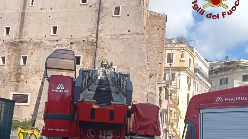 ROMA, 03 NOV - Crollo di una parte della Torre dei Conti, attualmente in ristrutturazione, a largo Corrado Ricci, ai Fori Imperiali, nel cuore di Roma. Sul posto vigili del fuoco e agenti della polizia locale del I Gruppo Centro che hanno chiuso il traffico pedonale e veicolare nel tratto interessato per agevolare l'intervento da parte dei pompieri. A quanto riferito, la torre è attualmente in ristrutturazione.