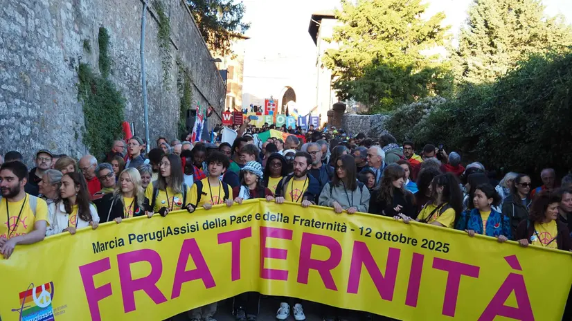 PERUGIA, 12 OTT - E' partita la Marcia PerugiAssisi della pace e della fraternità "Imagine all the people", Immagina tutte le persone vivere insieme in pace. L'arrivo della testa del corteo ad Assisi è previsto intorno alle 15. In tanti dietro al grande striscione con la scritta "Fraternità", con un grande drappo con i colori dell'iride e della Palestina. Per una delle edizioni più partecipate degli ultimi anni. Numerosa la presenza di associazioni, movimenti e singoli cittadine e cittadini ma anche delle Istituzioni, con la presidente della Regione Stefania Proietti, di quello della della Provincia di Perugia Massimiliano Presciutti e la sindaca Vittoria Ferdinandi. Con loro diversi leader di partito.