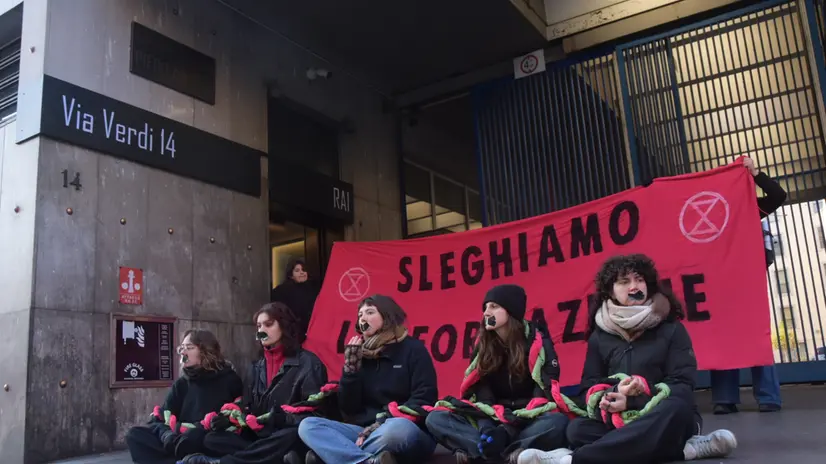 TORINO, 25 NOV - Dieci attiviste di Extinction Rebellion hanno occupato questa mattina la parte esterna dell'ingresso della sede Rai di via Verdi, a Torino, durante una protesta nel giorno contro la violenza sulle donne. Le partecipanti si sono legate tra loro con corde e si sono coperte la bocca con scotch nero, esponendo uno striscione con la scritta 'Sleghiamo l'informazione'. Secondo il movimento, l'azione intende denunciare una narrazione ritenuta distorta da parte dei media. "Occupiamo l'entrata della Rai, perché invece che svolgere il suo compito di informare correttamente la popolazione propone delle narrazioni distorte", afferma una portavoce, Elsa. A suo avviso questo riguarda "i temi dei femminicidi, della crisi ecoclimatica e del genocidio a Gaza, temi profondamente intrecciati come i nastri con cui ci siamo legate. Temi segnati dalla più grande delle violenze: il silenzio". "Stando a quanto emerge dal rapporto dell'Osservatorio Step - riporta una nota del movimento -, i media italiani nel raccontare i femminicidi utilizzano ancora termini come "raptus" - anche se in misura minore negli ultimi anni - e prediligono l'empatia nei confronti del carnefice e la spettacolarizzazione nei casi di stupro e violenza sessuale. La scelta delle parole influenza la percezione del pubblico, e la mancanza di linguaggio e narrazione adeguata nei media emerge anche nel campo ambientale, come sottolinea il rapporto annuale dell'Osservatorio Pavia: un ultimo esempio è l'ondata di calore di giugno, quando meno di un quarto dei servizi nei tg serali citava la crisi climatica come causa del fenomeno". "Vogliamo - conclude Elsa - un'informazione libera e critica, che smascheri le narrative distorte, invece di alimentarle. Un informazione capace di responsabilizzare i cittadini e chi detiene il potere, che dia voce alle vittime, invece di proteggere i carnefici. Un'informazione in cui verità e giustizia siano centrali, e in cui la violenza non sia mai normalizzata".