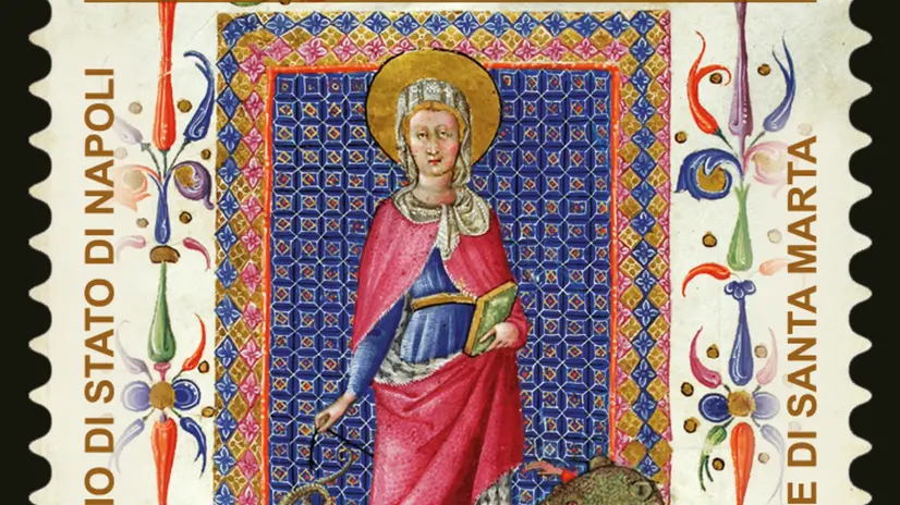 ROMA, 24 NOV - Oggi sono stati emessi due francobolli (validi per la posta ordinaria spedita in Europa e nel Bacino del Mediterraneo) dedicati agli archivi di Stato come ''eccellenze del patrimonio culturale italiano''. Le vignette rappresentano: il complesso di sant'Ivo alla Sapienza, sede dell'Archivio di Stato di Roma; una pagina miniata del Codice di Santa Marta, custodito presso l'Archivi di Stato di Napoli, che mostra la figura di Santa Marta vestita d'azzurro con mantello rosso e il capo coperto da velo, con alle spalle la Tarasca, il mostro che ha sconfitto. Il bollettino illustrativo che accompagna l'emissione è firmato da Antonio Tarasco, Direttore generale Archivi di Stato.
