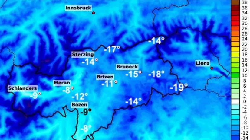 BOLZANO, 08 GEN - L'ondata di freddo che sta interessando le Alpi ha raggiunto il suo apice la scorsa notte. In Alto Adige tutte le località registrano valori nettamente sotto lo zero. Sesto, il paese del tennista Jannik Sinner, si è confermata la località più freddo con una minima di -19 gradi, mentre nelle zone a bassa quota spicca il dato di Gargazzone, dove il termometro ha segnato -12 gradi. I bolzanini si sono invece svegliati con -8 gradi. Nonostante il freddo polare, non si tratta di un fenomeno insolito: il record storico resta infatti lontano, con -29 gradi registrati a Dobbiaco il 10 febbraio 1969, ricorda il meteorologo provinciale Dieter Peterlin. Verso il fine settimana i valori risaliranno leggermente. Un nuovo calo termico è atteso per lunedì, prima che l'ondata di freddo si esaurisca definitivamente nel corso della prossima settimana. L'inverno resta avaro di neve in Alto Adige. La cresta di confine sarà parzialmente interessato oggi da una perturbazione che porterà tra i 5 e i 10 centimetri di neve. Per la giornata di domani non si escludono brevi rovesci nevosi anche nelle zone più a sud.