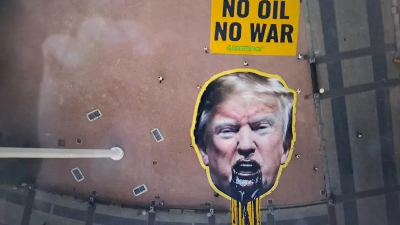 Greenpeace esibisce immagine di Trump che vomita petrolio, 'no oil, no war'