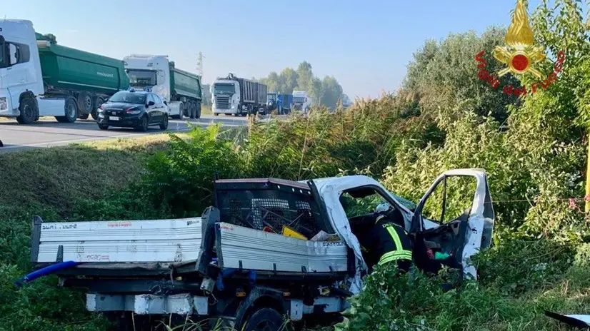 ROVIGO, 07 OTT - Un uomo è morto e altri due sono rimasti gravemente feriti stamattina a Porto Viro (Rovigo), in un incidente avvenuto intorno alle 8 lungo la statale 309 Romea al chilometro 69+700 che ha coinvolto due autoarticolati e un furgone da cantiere. I vigili del fuoco del distaccamento di Adria hanno estratto i due uomini a bordo del furgone finito in un fossato: un uomo, dopo la stabilizzazione da parte del Suem 118, è stato elitrasportato in ospedale, mentre il medico del 118 ha constatato il decesso del secondo. Anche l'autista di un autoarticolato è stato trasportato in ospedale. Secondo una prima ricostruzione, il furgone stava svoltando a sinistra quando è stato tamponato da un autoarticolato. A seguito dell'urto il mezzo ha invaso la corsia opposta, dove sopraggiungeva un secondo autoarticolato che non ha potuto evitare l'impatto frontale-laterale. La statale 309 Romea è stata chiusa al traffico per le operazioni di soccorso e messa in sicurezza. Sul posto le forze dell'ordine per la gestione della viabilità e l'accertamento delle cause.