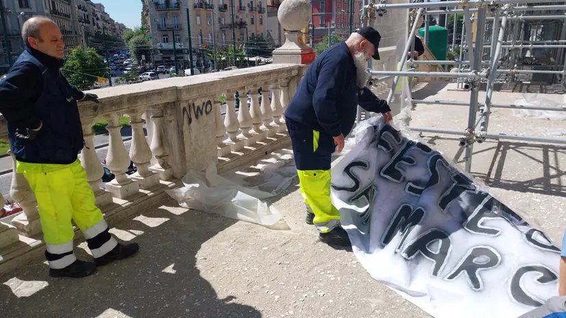 NAPOLI, 25 APR - E' stato rimosso questa mattina dagli operatori della società Napoli Servizi uno striscione, su una balaustra dell'Albergo dei Poveri, a Napoli con la scritta "Io festeggio San Marco" e sotto la sigla 'FN'. L'operazione è stata disposta del sindaco Manfredi "per garantire che le celebrazioni del 25 Aprile si svolgano nel rispetto della Festa di Liberazione dal Nazi-Fascismo".