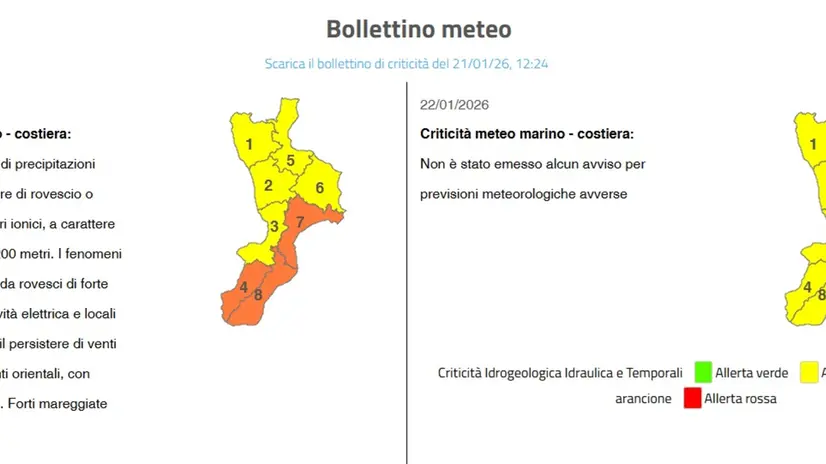 CATANZARO, 21 GEN - L'allerta meteo sulle zone ioniche del Catanzarese e su quelle ioniche e tirreniche del Reggino è scesa, per la giornata di oggi, ad arancione. E' quanto evidenzia l'ultimo bollettino della Protezione civile. La situazione meteorologica appare in miglioramento. Domani, infatti, è previsto un ulteriore declassamento con allerta gialla su tutta la Calabria.