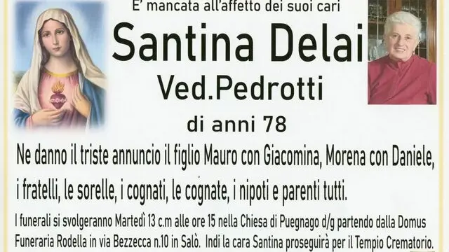BRESCIA, 10 FEB - Saranno celebrati martedì pomeriggio i funerali di Santina Delai, la 78enne uccisa mercoledì all'alba a Puegnago del Garda, nel Bresciano. L'unico figlio dell'anziana, Mauro Pedrotti, 54 anni, è stato arrestato 24 ore dopo per omicidio volontario premeditato e ha confessato il delitto. Negli annunci funebri online e affissi in paese tra chi annuncia la morte della 78enne c'è proprio il figlio Mauro con la moglie oltre alle sorelle della vittima. "Domenica 28 gennaio avevo discusso con mia mamma per il fatto che io volessi vendere casa mia e lei non era d'accordo. Io ho sofferto per quest'ultima discussione. L'ho uccisa perché ero stufo del suo carattere, mi comandava di fare ogni cosa" ha confessato Mauro Pedrotti, che ha strangolato la madre e poi ha inscenato un furto in casa.