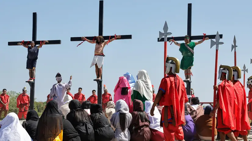 MANILA, 03 APR - Centinaia di filippini e turisti si sono radunati in occasione del ;;Venerdì Santo per assistere alla manifestazione religiosa più cruenta del Paese, con una partecipazione massiccia anche quest'anno, nonostante l'aumento dei prezzi del carburante in un Paese che affronta un'emergenza energetica. Decine di uomini a torso nudo, con il volto coperto da panni, hanno camminato scalzi per le strade polverose di San Fernando, nella provincia di Pampanga, a nord-ovest di Manila, fustigandosi la schiena con fruste di bambù sotto il caldo torrido. I giornalisti hanno osservato i fedeli che si trafiggevano deliberatamente la pelle con schegge di vetro attaccate a piccole tavolette di legno per assicurarsi di sanguinare durante il rituale, un modo per purificarsi dai peccati e sperare in un miracolo. "Lo faccio per pregare per la guarigione del mio bambino di sette mesi, che ha la polmonite", ha detto John David, frusta in mano, all'inizio della processione. "Mio nonno ha iniziato, poi mio padre, e ora tocca a me", ha aggiunto il 49enne. "Nel corso degli anni, ho assistito a miracoli di guarigione attraverso questo atto di fede". Questo spettacolo annuale, che commemora la Passione, la crocifissione e la morte di Gesù Cristo in questo Paese a maggioranza cattolica, attira in genere 12.000 spettatori, turisti e residenti. In tanti hanno assistito al momento culminante dell'evento: quando ai fedeli vengono conficcati dei chiodi lunghi circa otto centimetri nei palmi delle mani prima di essere issati su una croce.