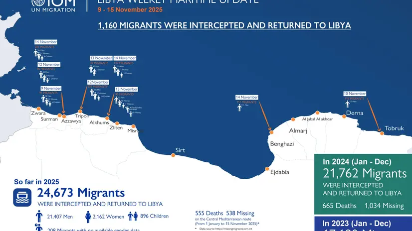 - TUNISI, 19 NOV - Almeno 555 persone sono morte e 538 risultano disperse sulla rotta del Mediterraneo centrale dall'inizio dell'anno al 15 novembre. Lo rende noto l'Organizzazione internazionale per le migrazioni (Oim) in Libia nel suo ultimo aggiornamento pubblicato su X. Nello stesso periodo, precisa l'agenzia dell'Onu, i migranti intercettati in mare e riportati in Libia sono stati 24.673, di cui 21.407 uomini, 2.162 donne, 896 minori e 208 di cui non si conoscono i dati di genere.