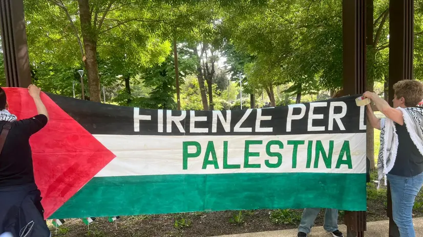 FIRENZE, 19 APR - Bandiere e striscioni di Firenze per la Palestina questo pomeriggio davanti al Teatro del Maggio contro la prima rappresentazione dell'opera 'The Death of Klinghoffer', regia di Luca Guadagnino, che apre ufficialmente l'88/o Festival del Maggio Musicale Fiorentino e che è ispirata all'omicidio del cittadino Usa di origine ebraica Leonardo Klinghoffer nell'attacco alla nave da crociera Achille Lauro nel Mediterraneo da parte di terroristi del Fronte di Liberazione della Palestina nel 1985. "L'opera che state per vedere riguarda un episodio del 1985 - si legge in un volantino - L'evento è senza dubbio da condannare, ma chiediamoci come mai si sia scelto oggi in pieno genocidio di mettere in scena questo lavoro. Ci pare evidente l'intento di presentare la resistenza palestinese sotto l'aspetto terroristico". I promotori, un gruppo ridotto, hanno confermato quanto detto alcuni giorni fa, ovvero che la contestazione nasce dalla volontà di sottolineare come l'opera dia una lettura ''particolare del dramma e della crisi palestinese''. In particolare si evidenzia come l'opera prenda il via con due cori, quello degli esuli palestinesi e quello degli ebrei. ''Ci porta istintivamente a pensare che il contrasto sia tra i palestinesi e gli ebrei - dicono quelli di Firenze per la Palestina -, mentre il contrasto è tra i palestinesi e gli israeliani che hanno occupato la Palestina. Quindi non è una lotta tra due civiltà, tra due religioni, è una lotta tra un occupante e un occupato". Fuori dal teatro i ProPal fiorentini hanno allestito un presidio con bandiere, striscioni, ombrelli con scritte come pace, meno armi, 'Gaza new Auschwitz per non dimenticare' e 'Boicotta i prodotti israeliani'.