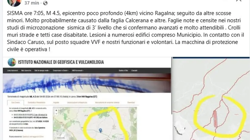 CATANIA, 04 MAR - Il sisma di magnitudo 4.5 registrato alle 7.05 sull'Etna, vicino a Ragalna, seguito da altre scosse di minore intensità, "molto probabilmente è stato causato dalla faglia Calcerana e altre faglie note e censite nei nostri studi di microzonazione sismica di terzo livello che si confermano avanzati e molto attendibili" ha causato "crolli di muri di strade e tetti case disabitate" e "lesioni a numerosi edifici, compreso il Municipio". Lo scrive su Facebook Salvo Cocina, capo dipartimento della Protezione civile regionale, che è in contatto col il sindaco Caruso. Sul posto, segnala Cocina, sono presenti squadre dei vigili del fuoco e nostri funzionari e volontari. "La macchina di protezione civile - conclude - è operativa".