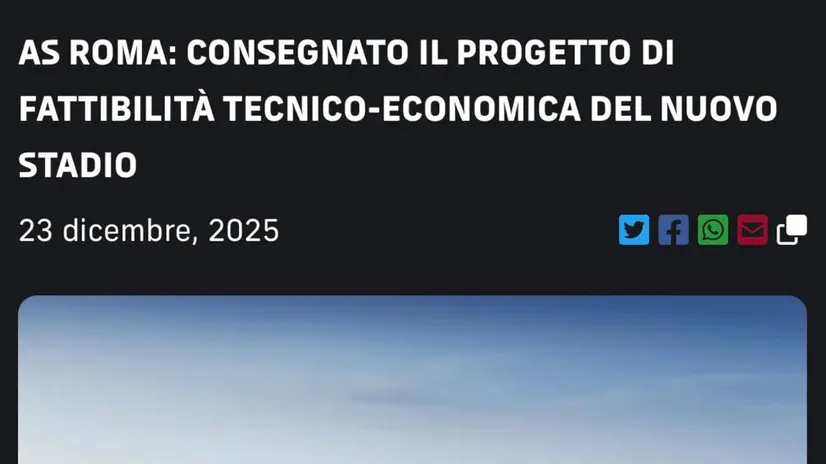 ROMA, 23 DIC - La Roma ha consegnato oggi al Campidoglio il progetto di fattibilità tecnico-economica del nuovo stadio. Il club "desidera rivolgere un ringraziamento speciale e personale al sindaco Roberto Gualtieri, per il suo sostegno, la sua disponibilità e la collaborazione costante che hanno reso possibile questo fondamentale avanzamento". La consegna del progetto definitivo "rappresenta un passo concreto verso l'inizio dei lavori e conferma la determinazione del club nel dotare Roma di un impianto moderno, ambientalmente sostenibile ed economicamente solido, che possa diventare motivo di orgoglio per la città e per tutti i suoi tifosi". "La consegna del Progetto di fattibilità tecnico-economica da parte dell'As Roma rappresenta un passaggio decisivo nel percorso verso la realizzazione del nuovo stadio, un progetto atteso da decenni. È un atto formale e sostanziale che consente di avviare i passaggi successivi, nel rispetto delle procedure previste. Roma Capitale ha sempre considerato questo intervento non solo come un'infrastruttura sportiva, ma come una grande occasione di rigenerazione urbana, capace di riqualificare un intero quadrante della città, migliorando la mobilità, i servizi e la qualità dello spazio pubblico", ha affermato il sindaco di Roma Roberto Gualtieri.