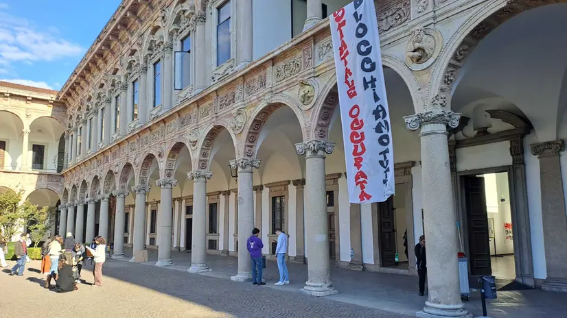 MILANO, 02 OTT - Gli studenti del collettivo Cambiare Rotta hanno occupato un'aula dell'università Statale di Milano per manifestare il loro sostegno alla Global Sumud Flotilla. Alcune decine di ragazzi sono riuniti in assemblea nell'Aula 211 dopo aver steso uno striscione con la scritta 'Statale occupata, blocchiamo tutto' nel cortile principale dell'ateneo. Alle pareti sono stati esposti cartelli che ricordano il corteo che si svolgerà nel pomeriggio e lo sciopero generale di domani. Nelle altre aule dell'università le lezioni si stanno svolgendo in modo regolare.