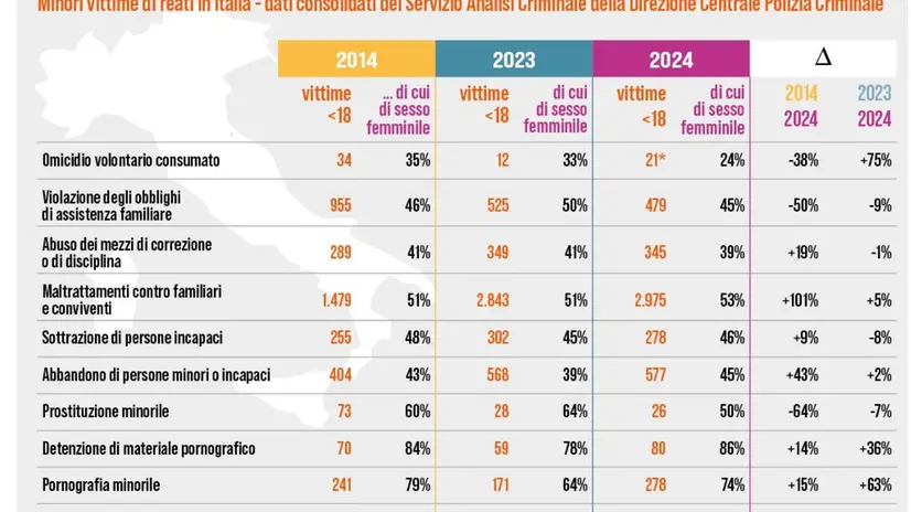 ROMA, 06 OTT - Nel 2024 per la prima volta in Italia è stata superata la cifra record di 7.000 reati a danno di minori. Sono stati 7.204 con 252 casi in più rispetto al 2023 (+4%),vmentre l'aumento su base decennale è del +35%. Le bambine e le ragazze si confermano le più colpite, sono il 63% delle vittime. Al top della triste classifica l'aumento dei reati connessi al digitale: pornografia minorile che su base annua segna un +63% e detenzione di materiale pedopornografico con +36%. I dati, elaborati dal Servizio Analisi Criminale della Direzione Centrale Polizia Criminale, sono stati resi noti dalla Fondazione Terre des Hommes in occasione della presentazione del Dossier indifesa "La condizione delle bambine e delle ragazze nel mondo" 2025 e in vista della Giornata internazionale delle bambine dell'11 ottobre.