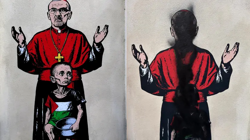 MILANO, 17 OTT - E' stato imbrattato il murale del patriarca di Gerusalemme Pierbattista Pizzaballa realizzato sulle pareti della Curia di Milano in via dell Ore da aleXandro Palombo, come già successo a diverse altre immagini dello street artist. Sono stati anneriti con la vernice l'immagine di un bambino palestinese con una pentola vuota e quella benedicente del cardinale. L'opera è stata quindi rimossa "con profondo rammarico" perché, hanno spiegato dal suo ufficio stampa, non poteva essere riparata.