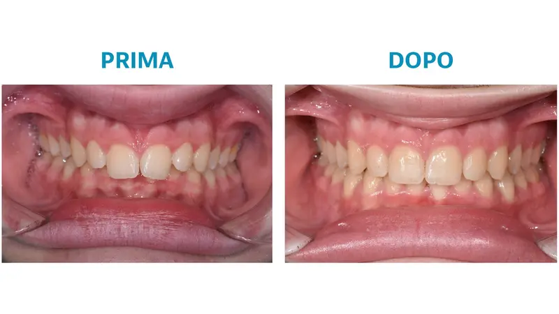 Caso ortodontico con allineatori trasparenti che hanno reso possibile la risoluzione del morso profondo e l’ampliamento delle arcate. Seguirà il protocollo di sbiancamento americano per migliorare il colore.