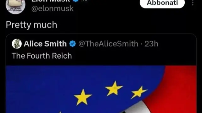 NEW YORK - L'Ue è il quarto Reich: Elon Musk alza i toni e torna ad attaccare Bruxelles e il Vecchio Continente rispondendo "praticamente" a un post che recita: "Quarto Reich". Sotto la scritta una svastica che spunta sotto la bandiera europea.
