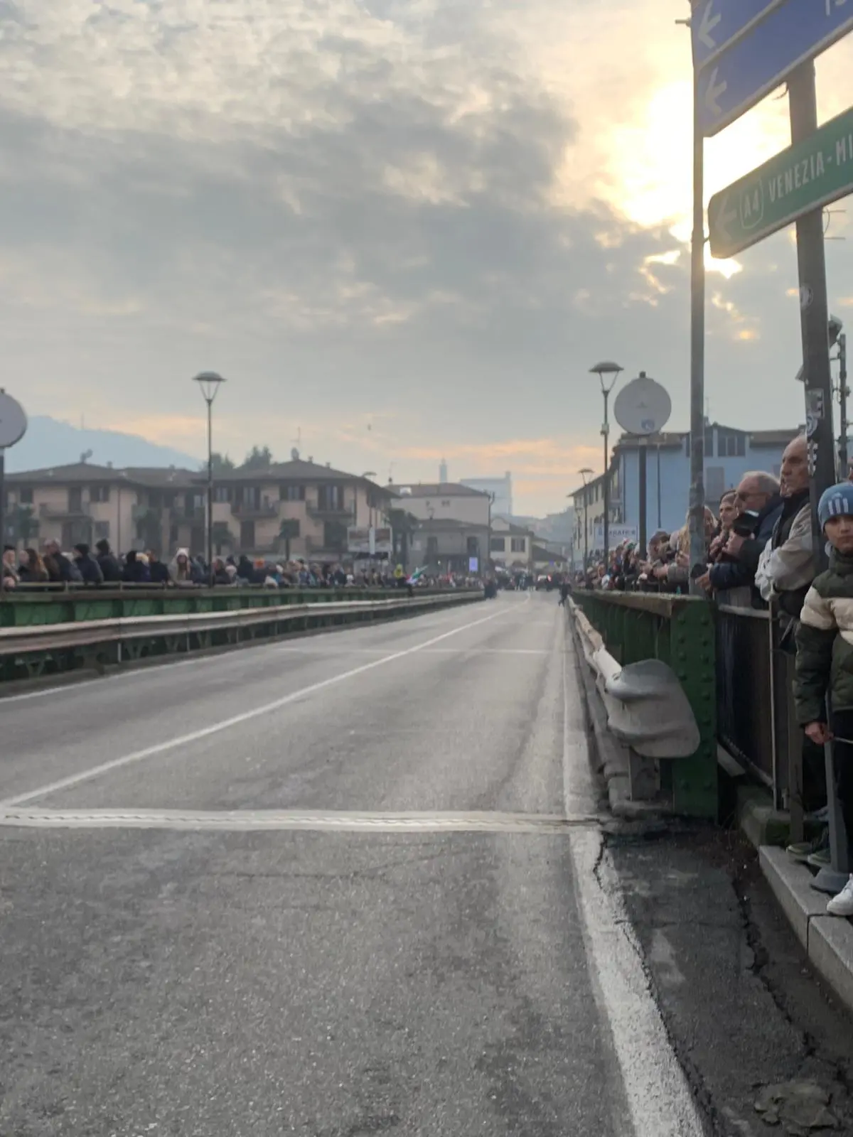 Il ponte tra Sarnico e Paratico, quello che deve attraversare la Fiamma olimpica per entrare in provincia di Brescia è gremito. Più di 500 persone attendono il tedoforo.